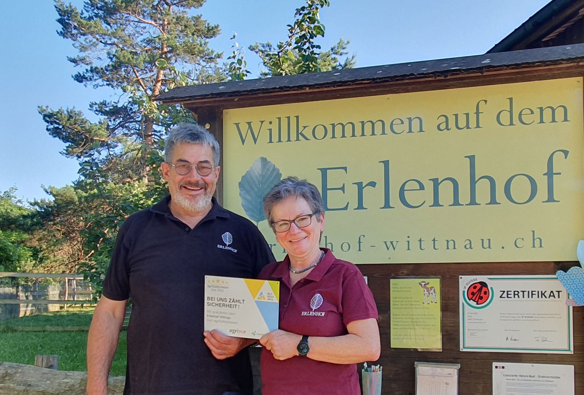 Herbert & Helen Schmid: «Einmal mehr bestanden wir die Sicherheitszertifizierung von unserem Erlenhof. Wir freuen uns erneut die neue Sicherheitsplakete zu empfangen, denn Sicherheit auf dem Hof mit Menschen und Tieren ist uns sehr wichtig, zum Wohle unserer Mitarbeiter, Kunden und Hofbesucher.»