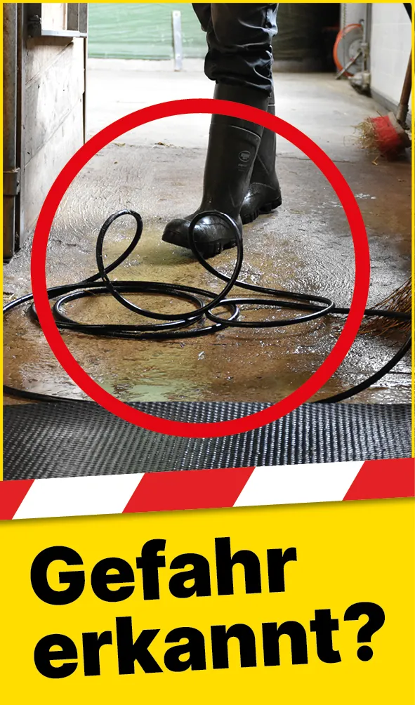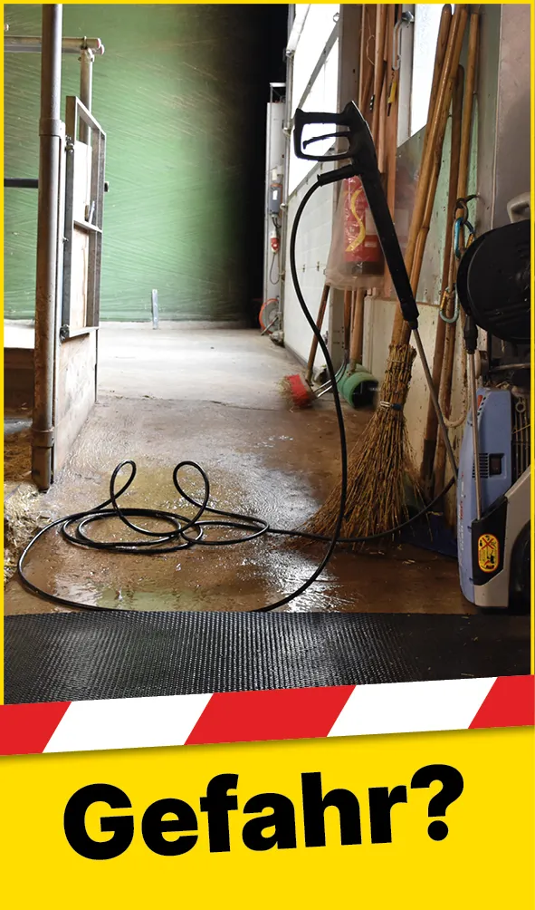 Der Wasserschlauch eines Hochdruckreinigers kann eine erhebliche Stolpergefahr darstellen. In beengten Arbeitsbereichen oder bei schlechten Sichtverhältnissen (Hell-Dunkel) kann der Schlauch leicht übersehen werden, was zu Stürzen und Verletzungen führen kann.