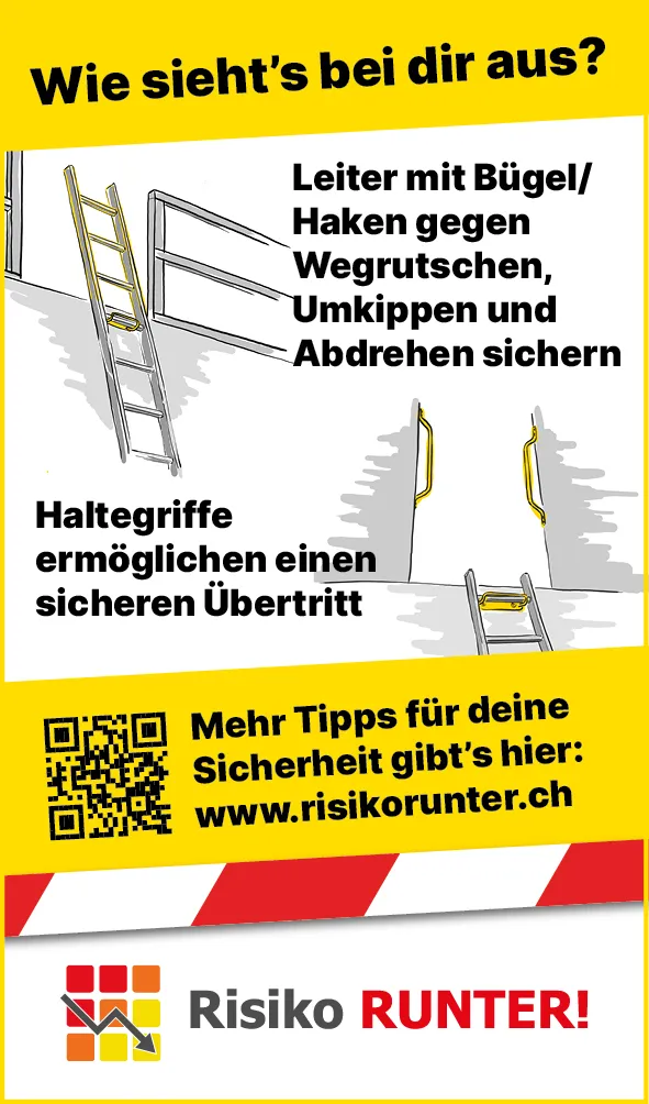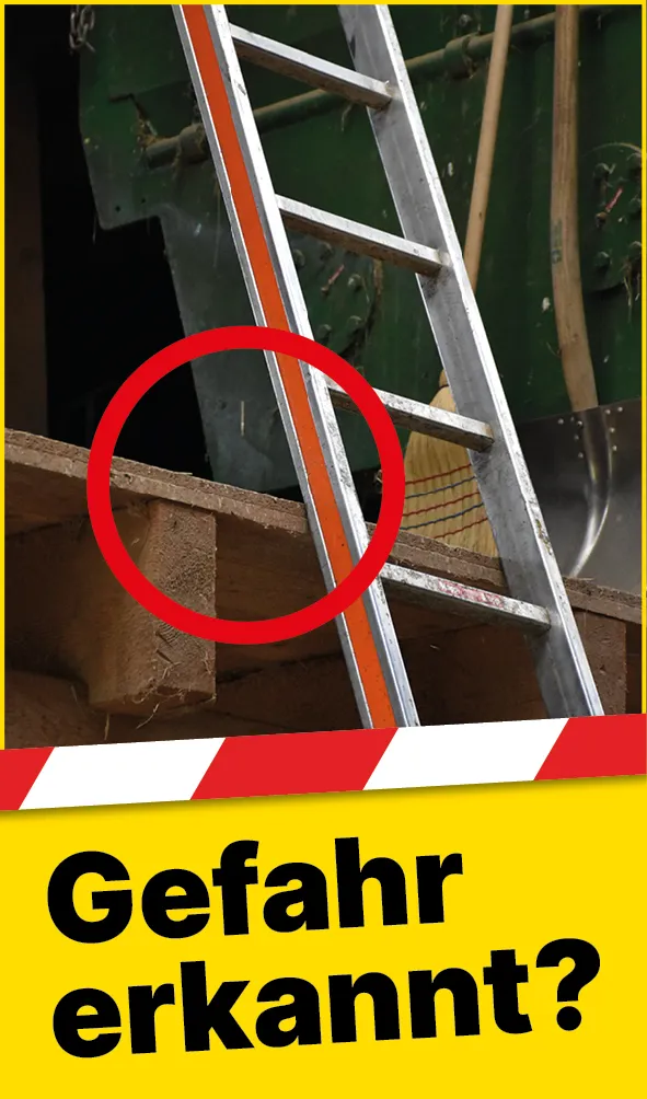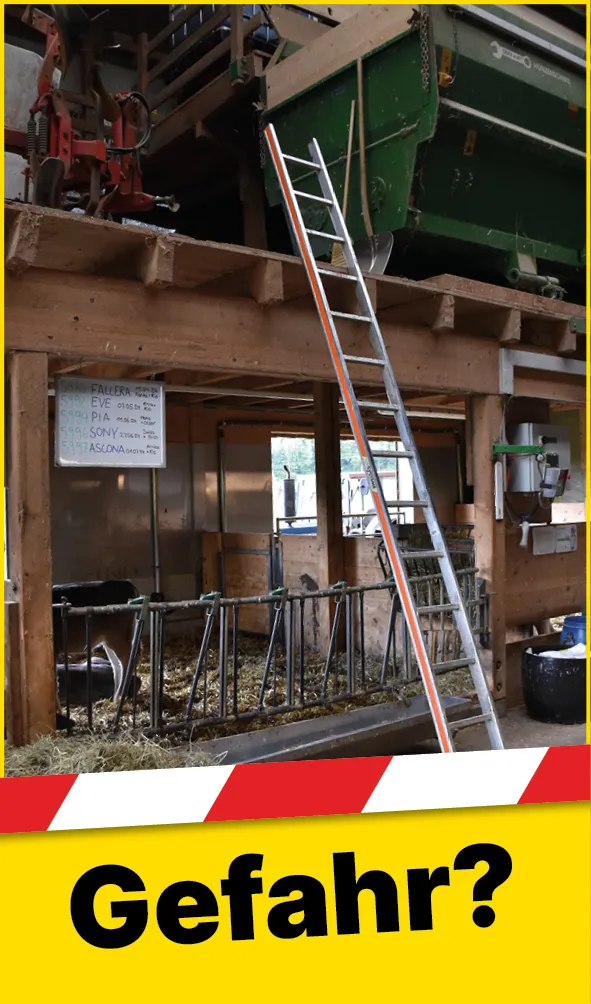 Ein Abrutschen, Umkippen oder Abdrehen der Leiter kann zu schweren Stürzen und Verletzungen führen. Bei fehlenden Haltevorrichtungen ist der Übertritt auf den Lagerboden und zurück auf die Leiter unsicher. Auf der Leiter werden keine Lasten transportiert.