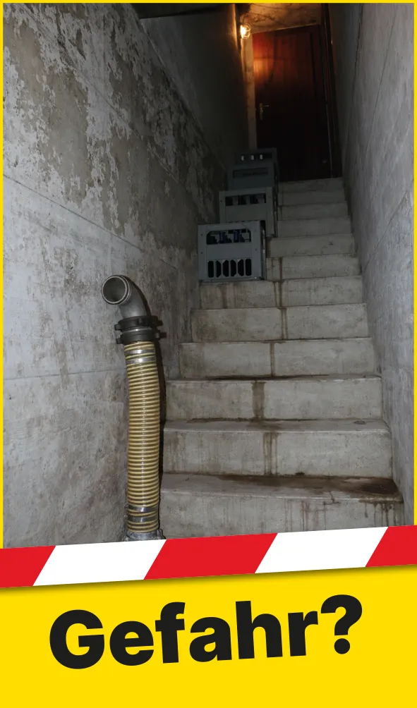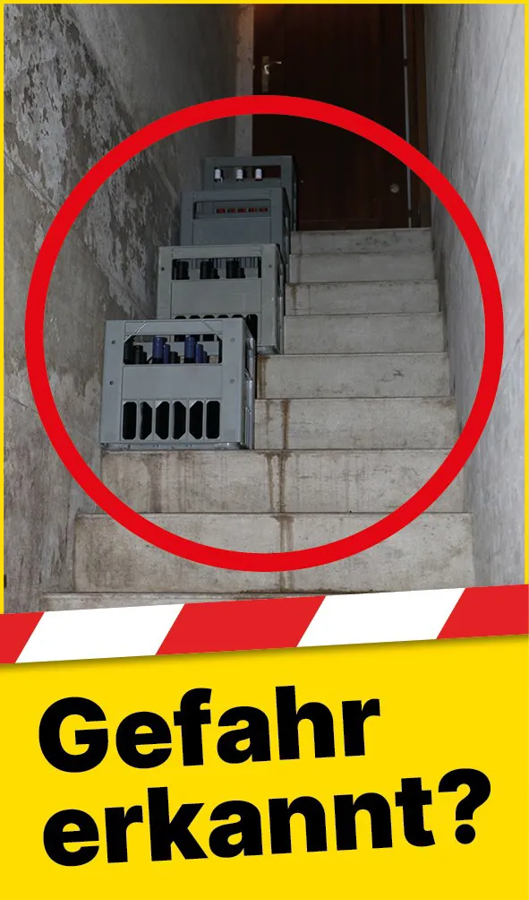 Abgelegte Gegenstände wie Werkzeuge, Kisten, Kleidung, usw. auf Treppen sind eine grosse Stolper- und Sturzgefahr. Besonders in einer Notsituation kann eine überstellte Treppe den Fluchtweg versperren oder einschränken.