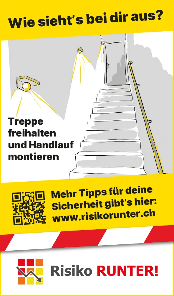 - Für gute Lichtverhältnisse sorgen. Bei Treppen, welche oft mit Lasten in der Hand begangen werden, bei Treppen in dunklen Bereichen sowie im Aussenbereich empfiehlt sich die Installation von Lampen mit Bewegungsmelder