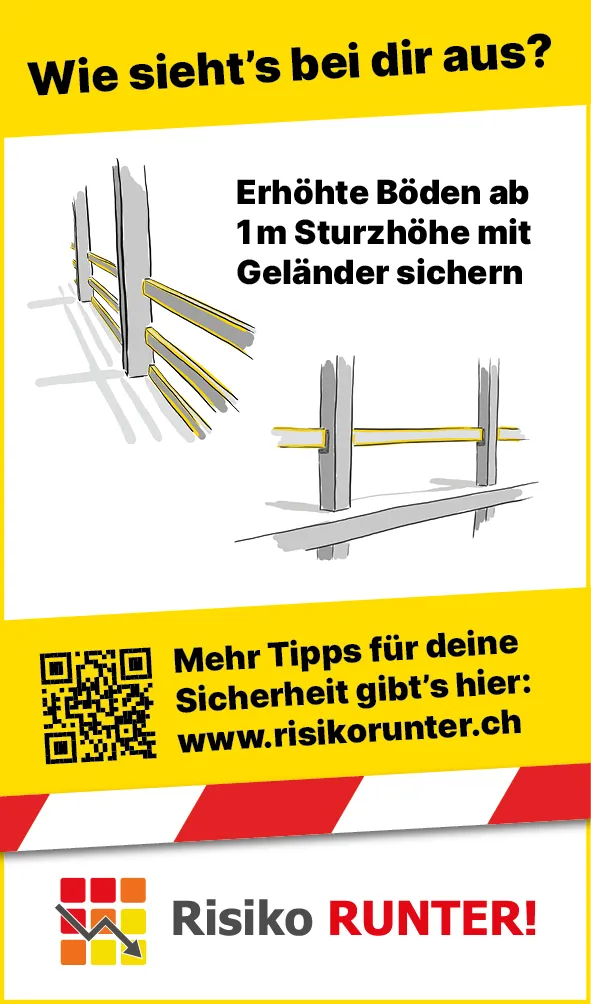 - Alle Absturzstellen über 1 m Höhe mit einem stabilen Geländer absichern
