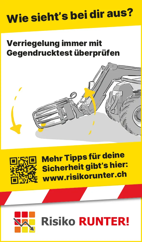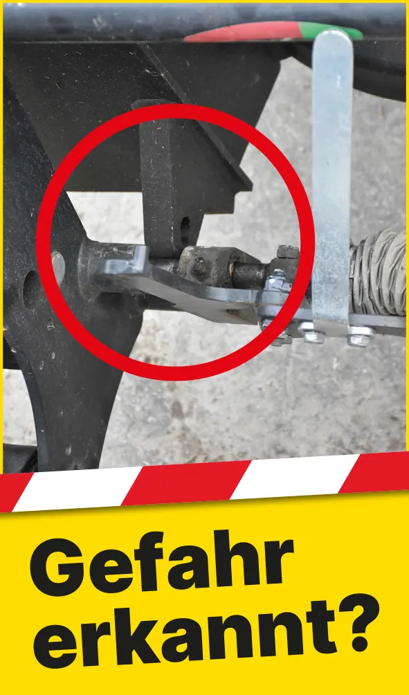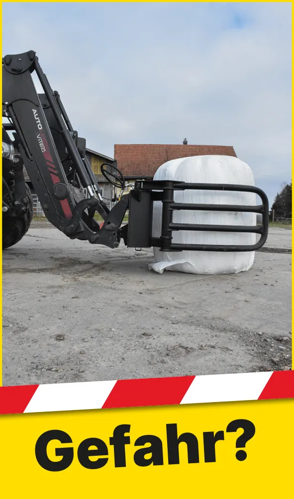 Ein nicht verriegeltes Anbaugerät am Frontlader oder anderen Hebefahrzeugen kann sich während der Fahrt, bei Hubarbeiten oder anderen Bewegungen des Hubarms lösen und unkontrolliert zu Boden fallen. Auch bei einer optischen Verriegelungsanzeige kann der Bolzen nicht korrekt eingerastet sein.