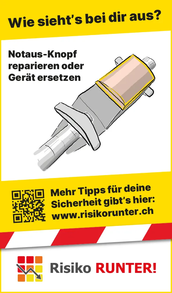 - Defektes Gerät ausser Betrieb nehmen/stilllegen und Not-Aus-Schalter fachgerecht reparieren lassen.