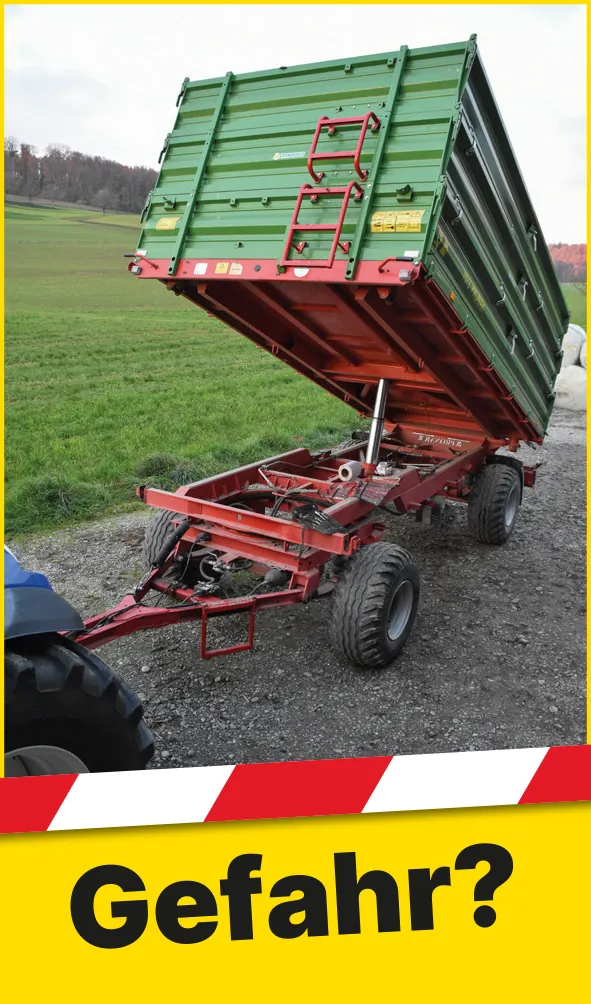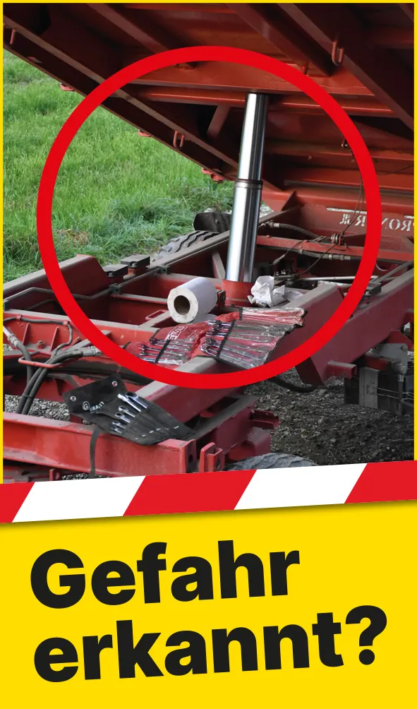 Ein angehobenes Anbaugerät kann sich durch plötzlichen Druckverlust im Hydrauliksystem, durch das Lösen mechanischer Teile oder eine Fehlmanipulation unbeabsichtigt absenken oder lösen und dadurch die unter der Maschine arbeitende Person gefährden.