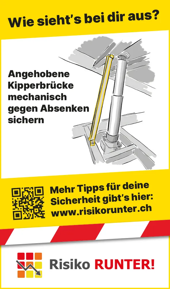Eine angehobene Lade- oder Kipperbrücke stellt ein erhebliches Sicherheitsrisiko dar, wenn sie nicht mechanisch gegen unbeabsichtigtes Absenken gesichert ist. Bei Wartungs- oder Reinigungsarbeiten unter der Brücke besteht die Gefahr, dass die Brücke durch ein technisches Versagen der Hydraulik plötzlich absinkt und die Person darunter schwer verletzt oder getötet wird.