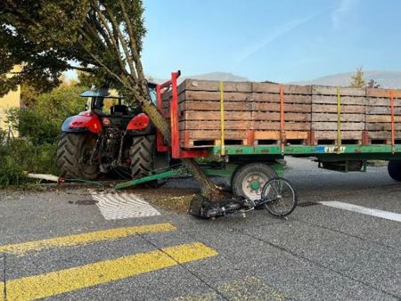 Am Montag, 2. Oktober 2023, gegen 7.40 Uhr, war ein Landwirt mit seinem Traktor und beladenem Anhänger von Oberdorf herkommend in Richtung Solothurn unterwegs. In Langendorf, Höhe Verzweigung Weissensteinstrasse/Fabrikstrasse, wechselte die dortige Ampel auf Rot, weshalb der Traktorlenker eine Bremsung einleitete. Aus noch zu klärenden Gründen wirkten nur die Bremsen des Traktors, nicht aber diejenigen des Anhängers. Dies hatte zur Folge, dass der Anhänger den Traktor nach vorne, in Richtung einer an der Ampel stehenden Fahrradlenkerin schob. Der Lenker des Traktors versuchte, der Fahrradlenkerin nach rechts auszuweichen. Dabei kam die Fahrzeugkombination von der Strasse ab und der Anhänger prallte schliesslich am rechten Strassenrand in einen Baum. Trotz diesem Ausweichversuch wurde die Fahrradlenkerin vom Anhänger erfasst und dabei leicht verletzt. Nebst dem Baum, welcher durch Angehörige der Feuerwehr Langendorf gefällt werden musste, wurde auch die Lichtsignalanlage beschädigt.