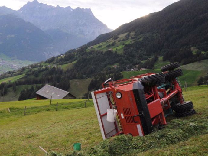 Ein 68-jähriger Mann war mit einem Transporter mit Ladegerät am Gras aufladen, als das Fahrzeug im steilen Gelände plötzlich umkippte. Der Mann wurde erheblich verletzt.