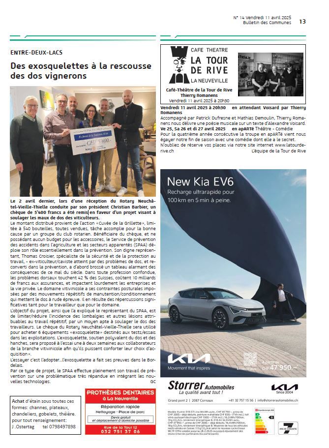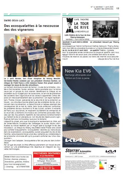 Le 2 avril dernier, lors d’une réception du Rotary Neuchâtel-Vieille-Thielle conduite par son président Christian Barbier, un chèque de 5’400 francs a été remis en faveur d’un projet visant à soulager les maux de dos des viticulteurs.