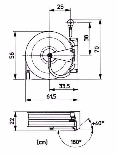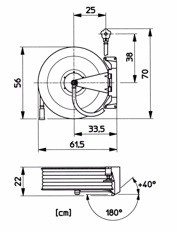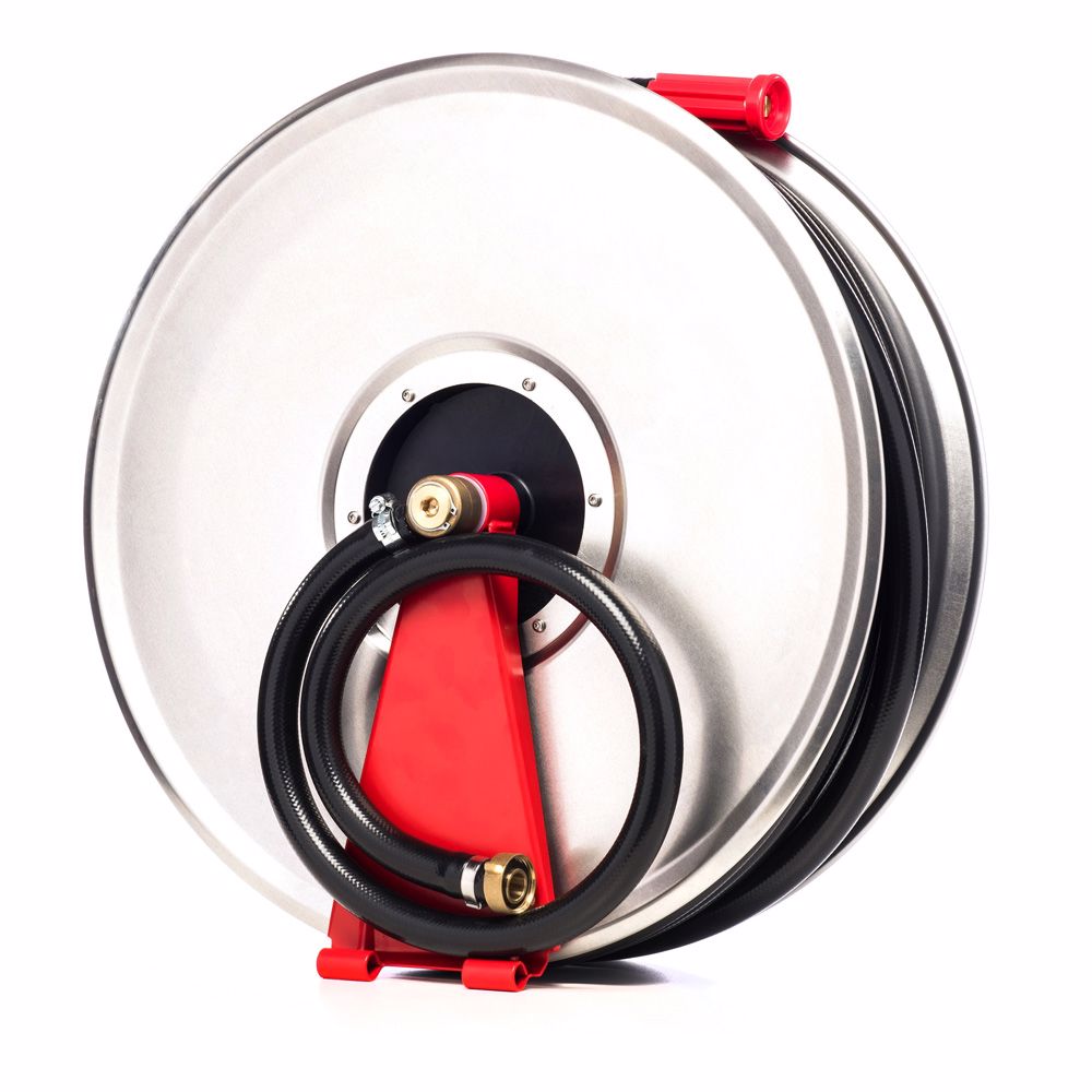 Tambour en plastique, disques en aluminium, tuyau Ø19/27 mm, tuyau à jet creux, montable à gauche/droite et enroulable.