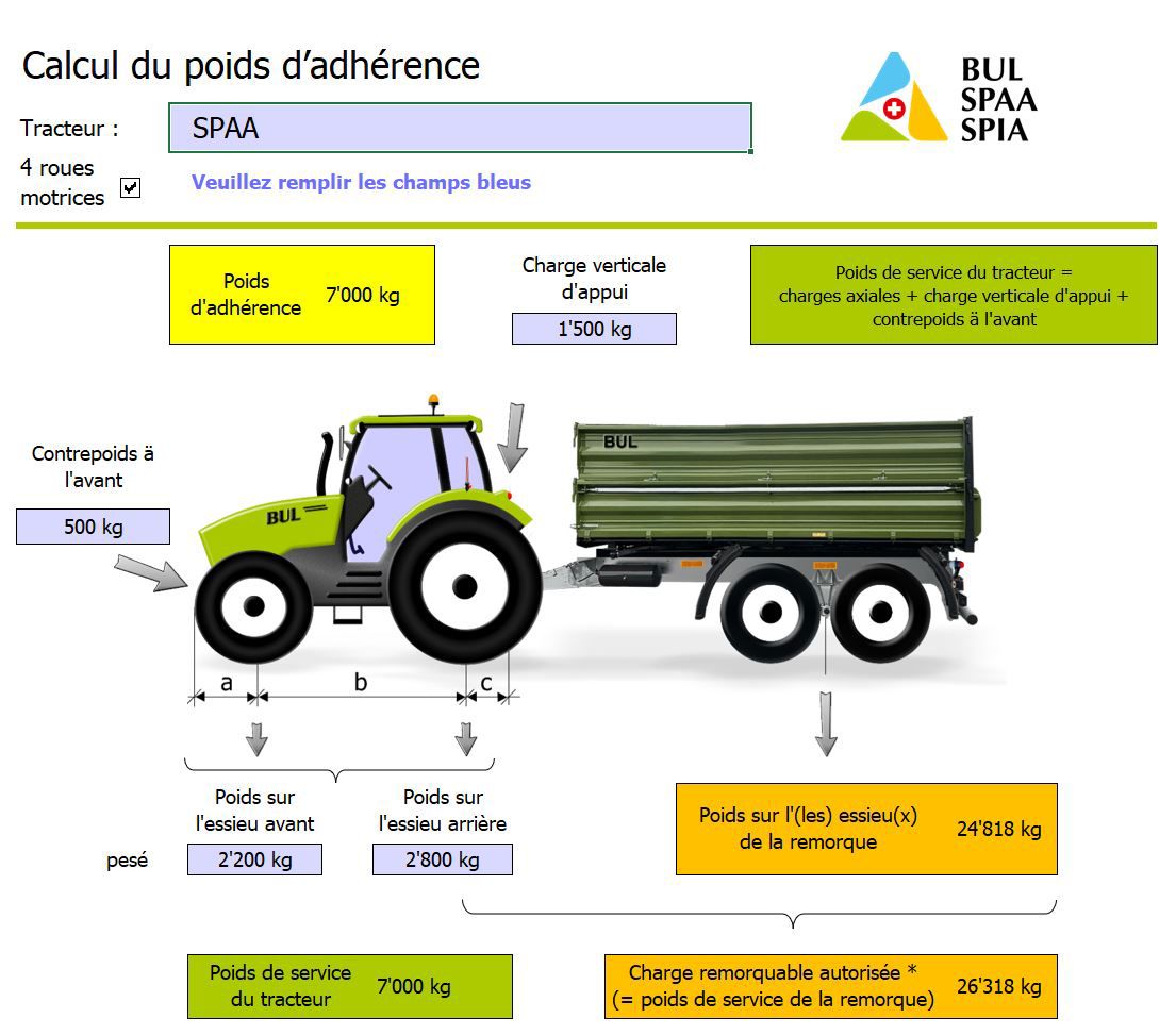 Avec un contrepoids à l'avant, on arrive à maîtriser la règle des 20 % du poids de service sur l'essieu directeur. Il faut également tenir compte du poids maximal en ordre de marche des essieux (éventuellement indiqué dans le permis de circulation) et de l'indice de charge des pneus. Le mieux est de vous rendre sur une balance avec votre combinaison chargée et de peser les charges par essieu. L'outil Excel du SPAA permet de vérifier par le calcul comment un train routier peut être optimisé. De plus, l'outil permet de calculer la valeur D et les charges par essieu en fonction de l'équipement.