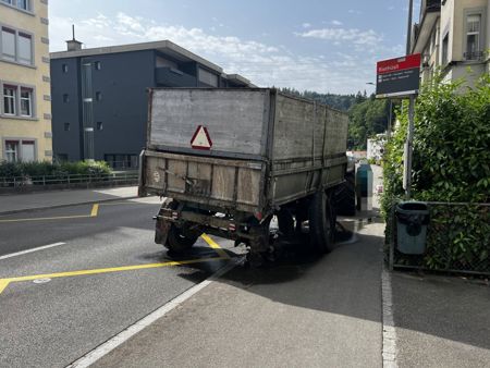 Am Mittwoch, 21.06.2023 kurz vor 10 Uhr erhielt die Stadtpolizei St.Gallen die Meldung über einen Traktor mit Anhänger, der bei der Teufener Strasse am Strassenrand steht, weshalb sich eine Patrouille vor Ort begab. Beim Anhänger fiel das rechte Hinterrad rund 36 Meter vor dem Stillstand ab. Nach einer Kontrolle der Stadtpolizei konnte eine fehlende Betriebssicherheit festgestellt werden. Nebst den Reifen waren Beleuchtungselemente defekt. Zudem war der Anhänger überladen und wies ein Gewicht von über 15000 kg, anstatt erlaubten 12000 kg auf. Der 44-jährige Chauffeur und Fahrzeughalter wird angezeigt und der Anhänger wurde aufgrund der fehlenden Betriebssicherheit abtransportiert.