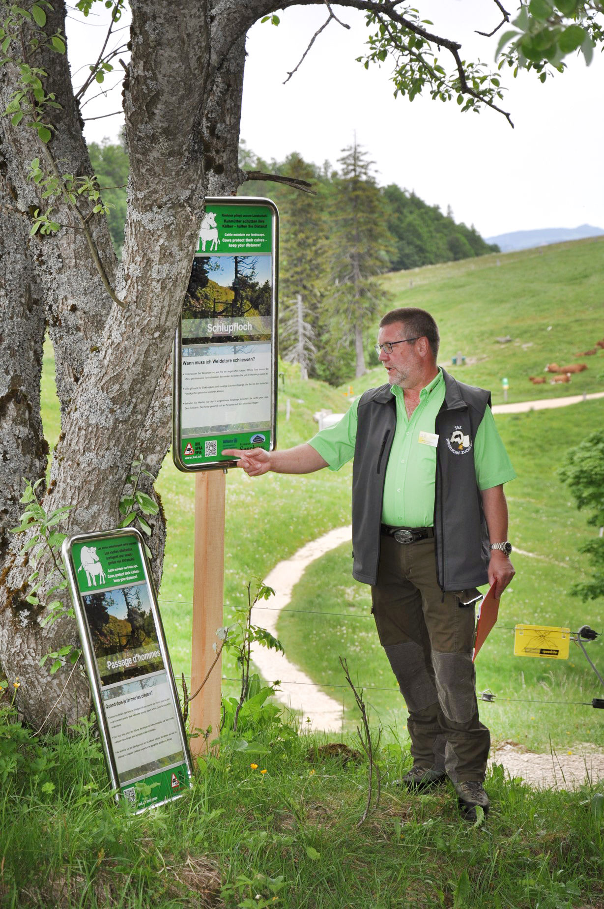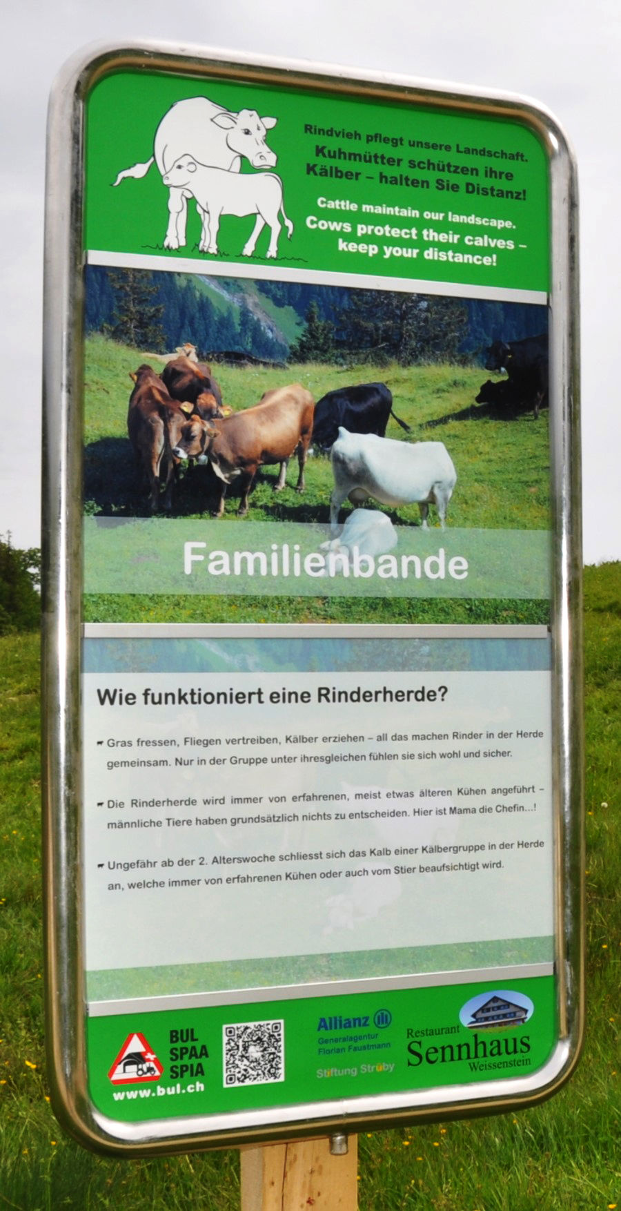 Der Lehrpfad gibt direkt im Weidegebiet einen Einblick in das Leben, die Instinkte und das Verhalten von Rindern. Er vermittelt Tipps zum richtigen Verhalten und zeigt, wie Konfrontationen vermieden werden können. Die Tafeln locken mit Schlagworten und geben in verständlichen, kurzen Sätzen Antworten auf verschiedene Fragen. Ein QR-Code führt zudem auf die Webseite rindvieh.bul.ch, welche die Tafelinhalte in deutsch, französisch, italienisch und englisch zeigt. Der Lehrpfad ist geeignet für Betriebe in Gebieten mit hoher Besucherfrequenz, entlang von Spazier- oder Wanderwegen, Weiden oder auch im Hofareal.