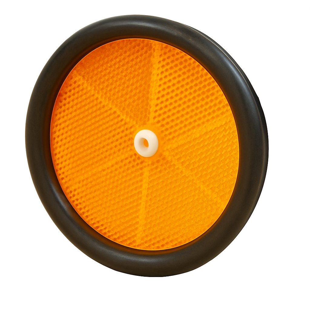 Rückstrahler Ø 80 mm, gelb, in Kunststoffgehäuse gefasst, mit Loch zur Befestigung durch Schrauben.