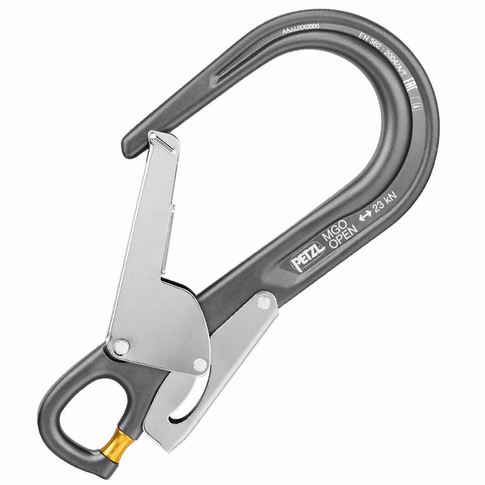 Das MGO OPEN 60 ist ein richtungsabhängiges Verbindungselement mit weiter Schnapperöffnung und automatischem Verriegelungssystem zum Einhängen an Metallstrukturen, Drahtseilen und Gestänge mit großem Durchmesser. Es verfügt über eine aufschraubbare Verbindungsöse für die Kombination mit unterschiedlichen Arten von Verbindungsmitteln. So kann das Verbindungselement im Falle einer Beschädigung des Verbindungsmittels wieder verwendet werden.